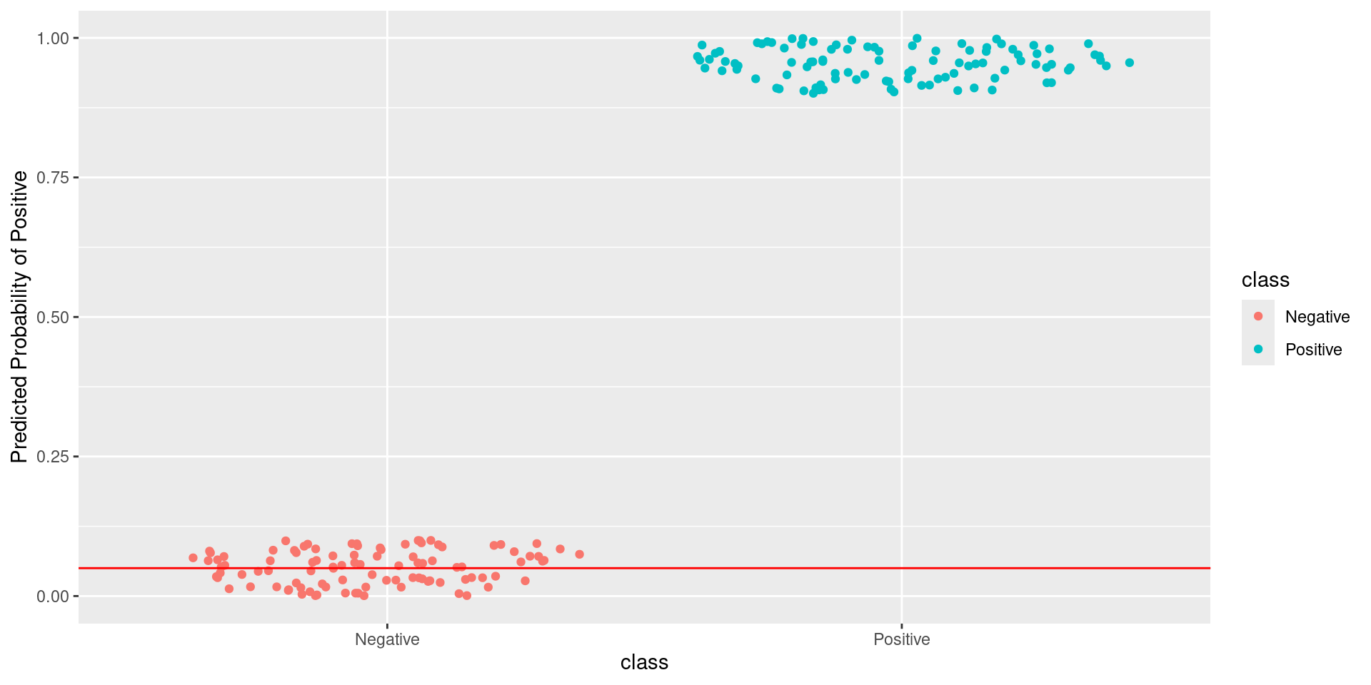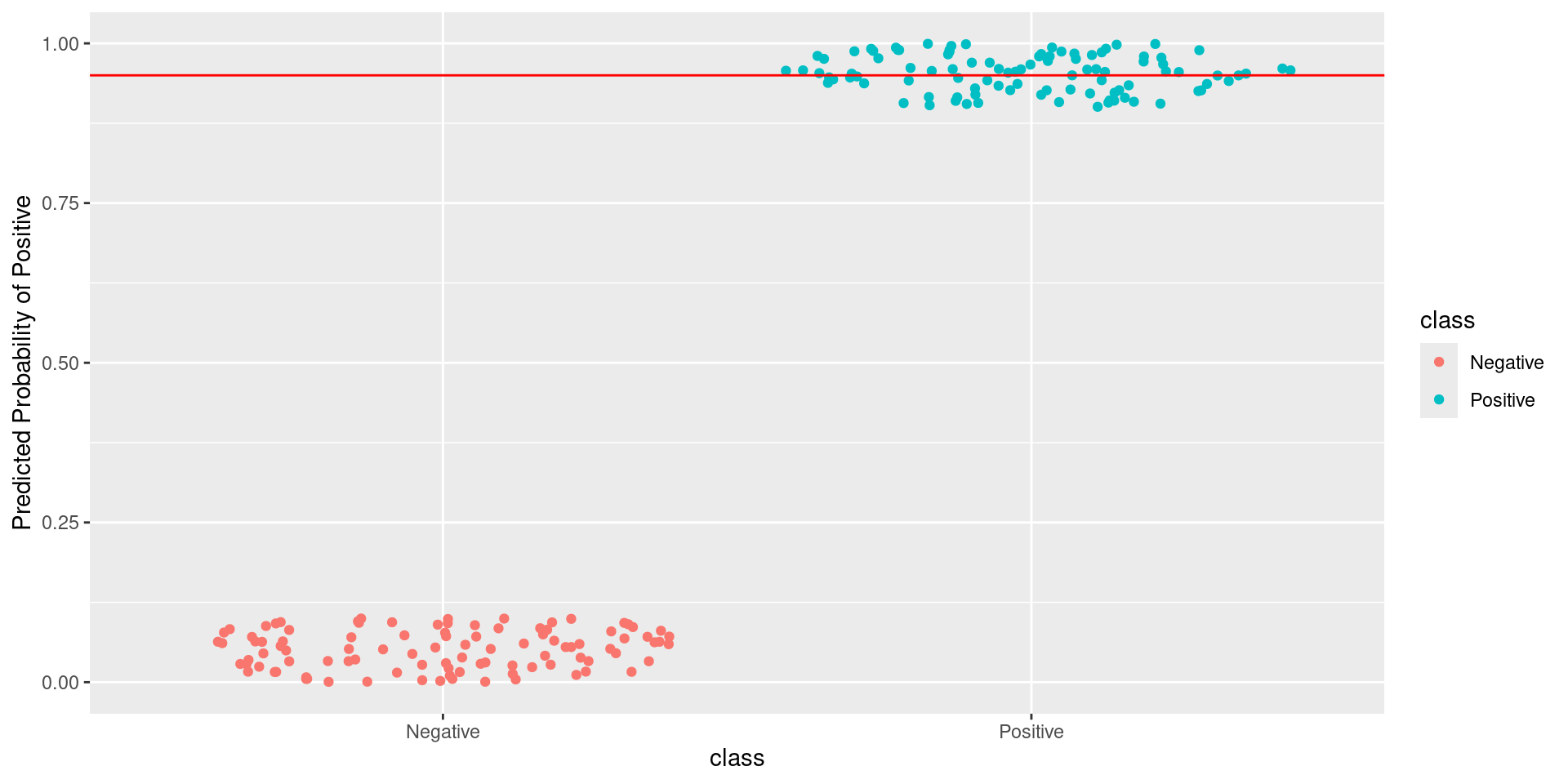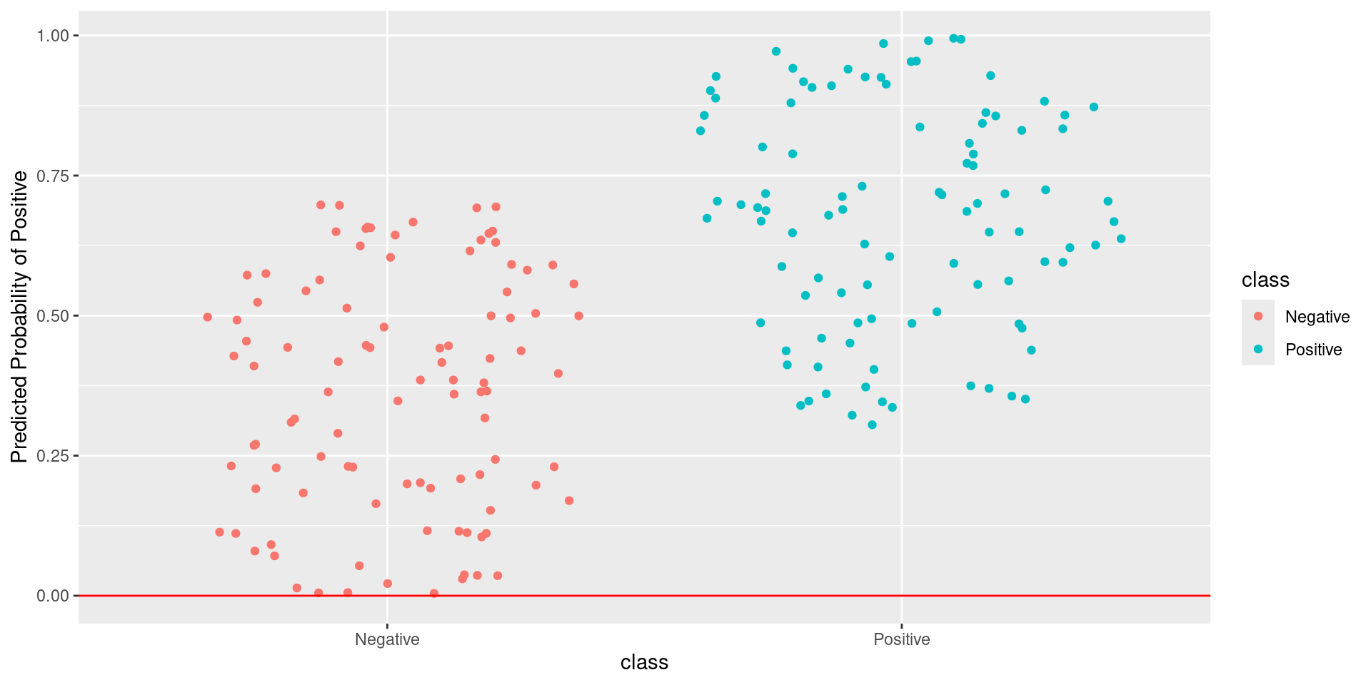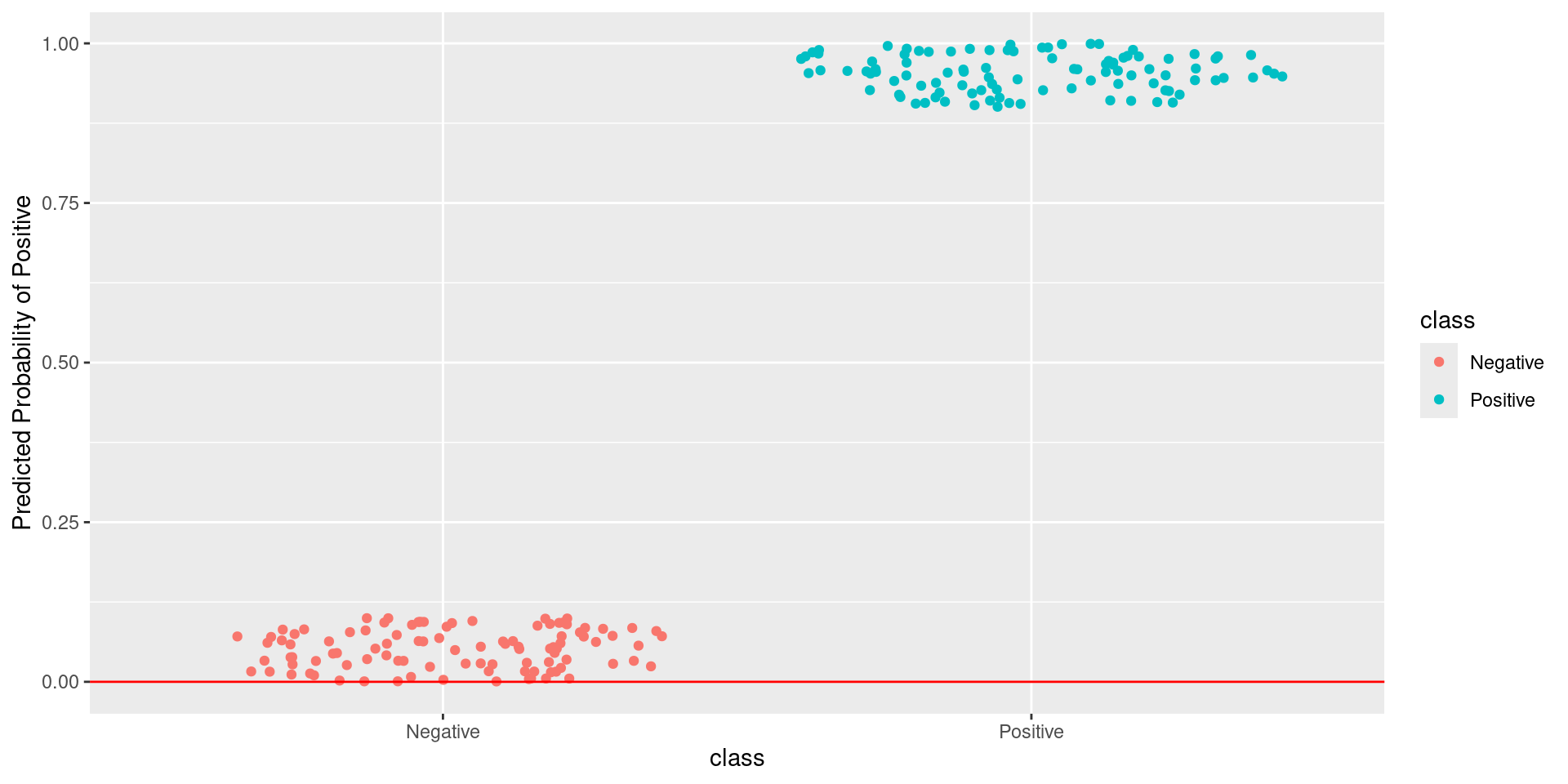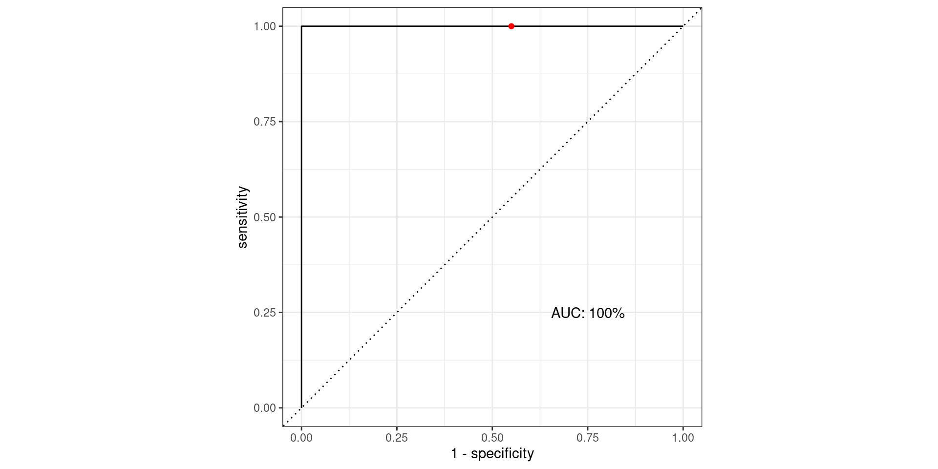 \[\text{Sensitivity} = \frac{TP}{TP + FN} = \frac{\text{Greens Above Line}}{\text{All Greens}} = \frac{100}{100} = 1\] \[1-\text{Specificity} = 1-\frac{TN}{TN + FP} = \frac{FP}{TN + FP} = \frac{\text{Reds Above Line}}{\text{All Reds}} = \frac{0}{100} = 0\]