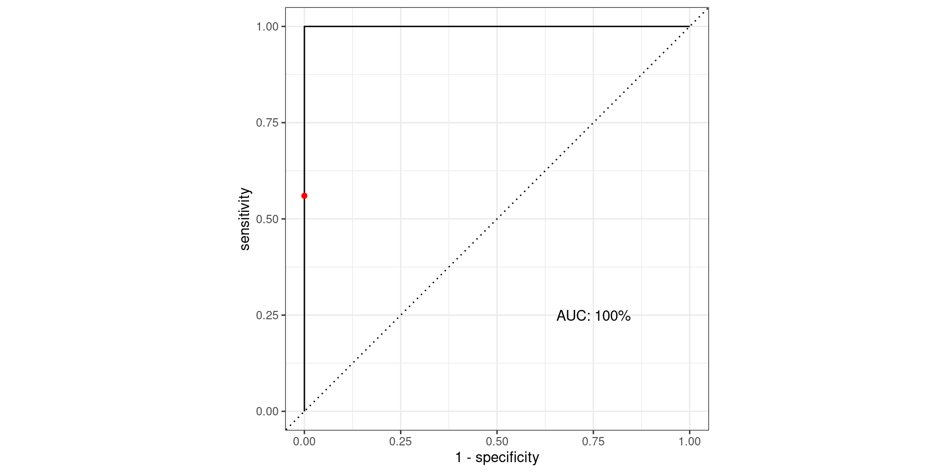 \[\text{Sensitivity} = \frac{TP}{TP + FN} = \frac{\text{Greens Above Line}}{\text{All Greens}} = \frac{56}{100} = 0.56\] \[1-\text{Specificity} = 1-\frac{TN}{TN + FP} = \frac{FP}{TN + FP} = \frac{\text{Reds Above Line}}{\text{All Reds}} = \frac{0}{100} = 0\]