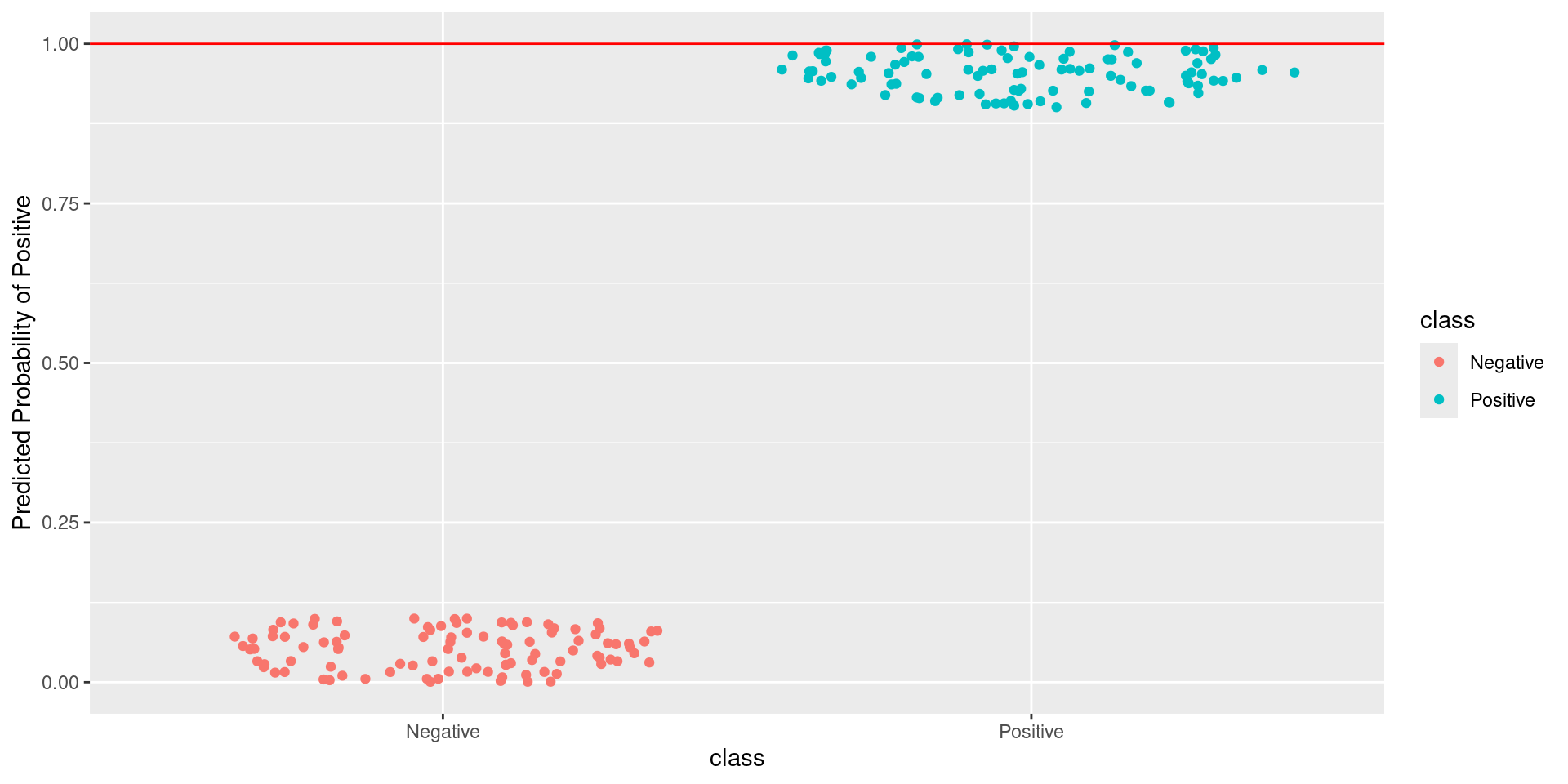\[\text{Sensitivity} = \frac{TP}{TP + FN} = \frac{\text{Greens Above Line}}{\text{All Greens}} = \frac{100}{100} = 1\] \[1-\text{Specificity} = 1-\frac{TN}{TN + FP} = \frac{FP}{TN + FP} = \frac{\text{Reds Above Line}}{\text{All Reds}} = \frac{100}{100} = 1\]
