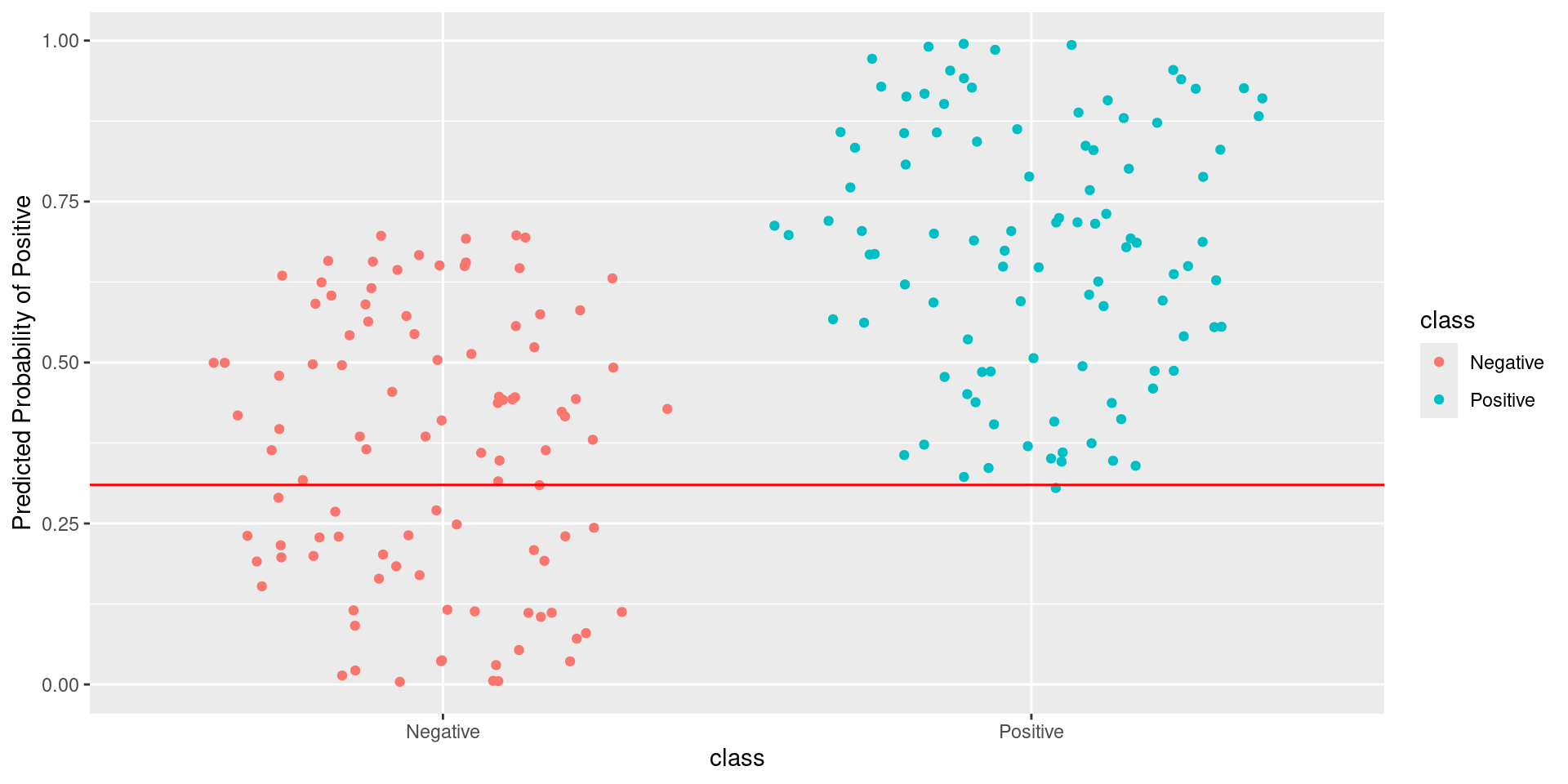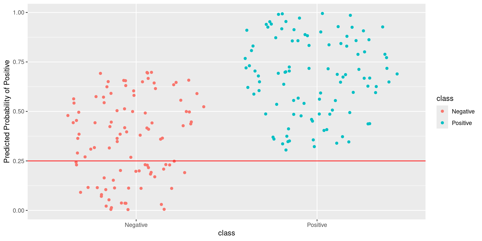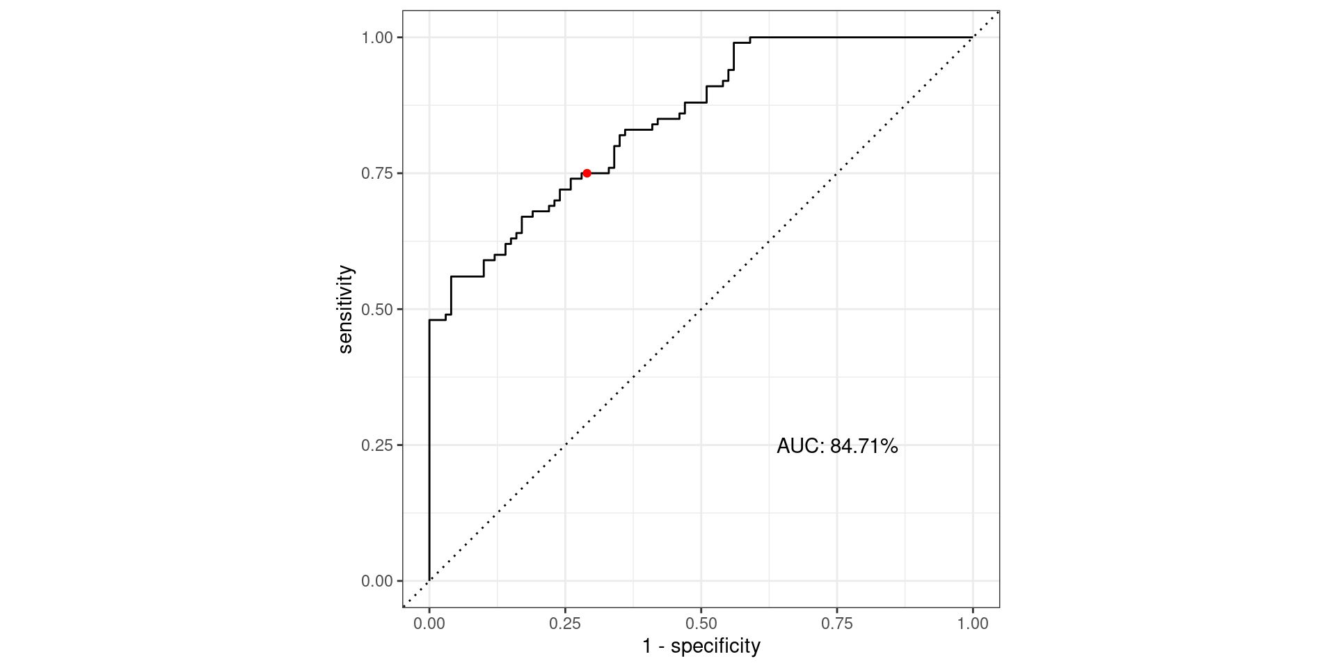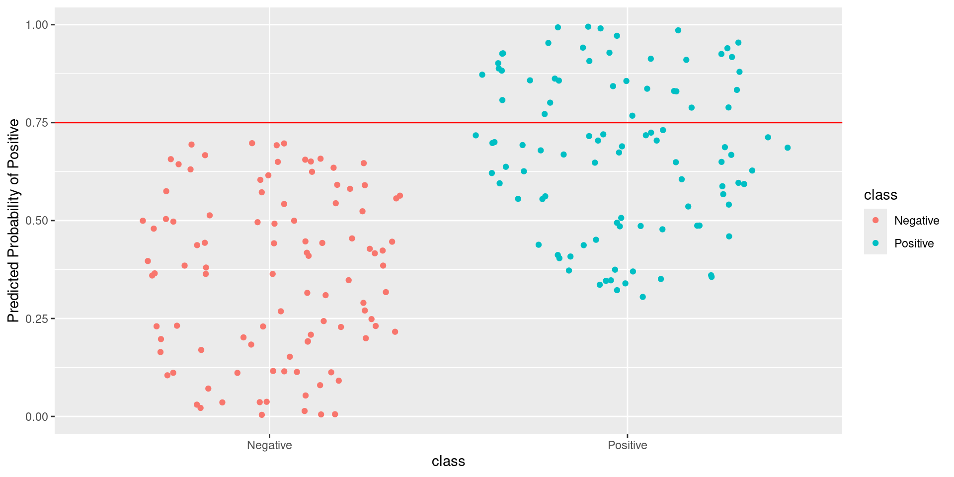 \[\text{Sensitivity} = \frac{TP}{TP + FN} = \frac{\text{Greens Above Line}}{\text{All Greens}} = \frac{75}{100} = 0.75\] \[1-\text{Specificity} = 1-\frac{TN}{TN + FP} = \frac{FP}{TN + FP} = \frac{\text{Reds Above Line}}{\text{All Reds}} = \frac{29}{100} = 0.29\]